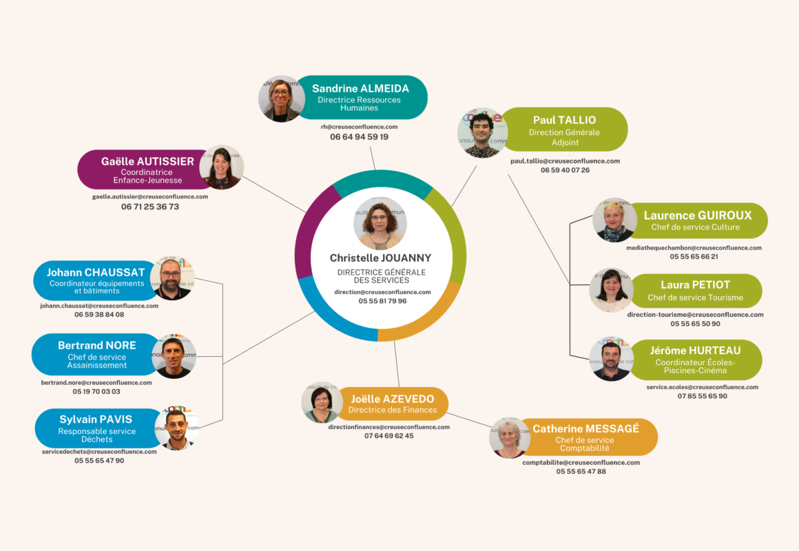 Pour mieux comprendre comment Creuse Confluence s’organise au quotidien, retrouvez ici l’organigramme de nos services. Il vous offre une vision simple et lisible de nos pôles, de leurs missions et de celles et ceux qui contribuent chaque jour à la vie des services.